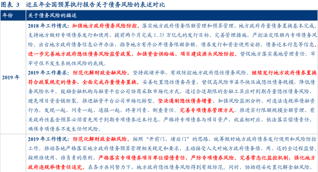 從近五年全國預(yù)算執(zhí)行報(bào)告對地方債務(wù)風(fēng)險(xiǎn)的表述來看,主要有以下變化: