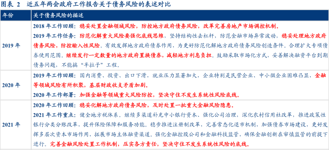 從近五年兩會政府工作報(bào)告對地方債務(wù)風(fēng)險(xiǎn)的表述來看,主要有以下變化: