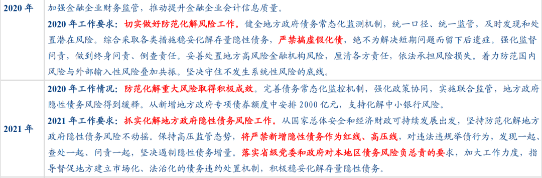 2、內(nèi)容上則更加側(cè)重補(bǔ)充強(qiáng)調(diào)降低利息。在“優(yōu)化債務(wù)期限結(jié)構(gòu),降低利息負(fù)擔(dān)”的基礎(chǔ)上提出“要壓實(shí)省級政府防范化解隱性債務(wù)主體責(zé)任”,再次強(qiáng)調(diào)把地方政府債務(wù)問題上升到省級,省需要統(tǒng)籌管理與承擔(dān)地市級、區(qū)縣級等城投平臺隱性債務(wù)責(zé)任;“穩(wěn)步推進(jìn)地方政府隱性債務(wù)和法定債務(wù)合并監(jiān)管”,該表述則進(jìn)一步表明政府層面對于地方政府隱性債務(wù)的態(tài)度近乎等同于法定債務(wù),因此隱性債務(wù)未來的償還化解具有保障性和確定性。