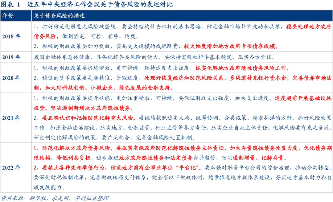 從近五年中央經(jīng)濟(jì)工作會議對地方債務(wù)風(fēng)險(xiǎn)的表述來看,主要有以下變化: