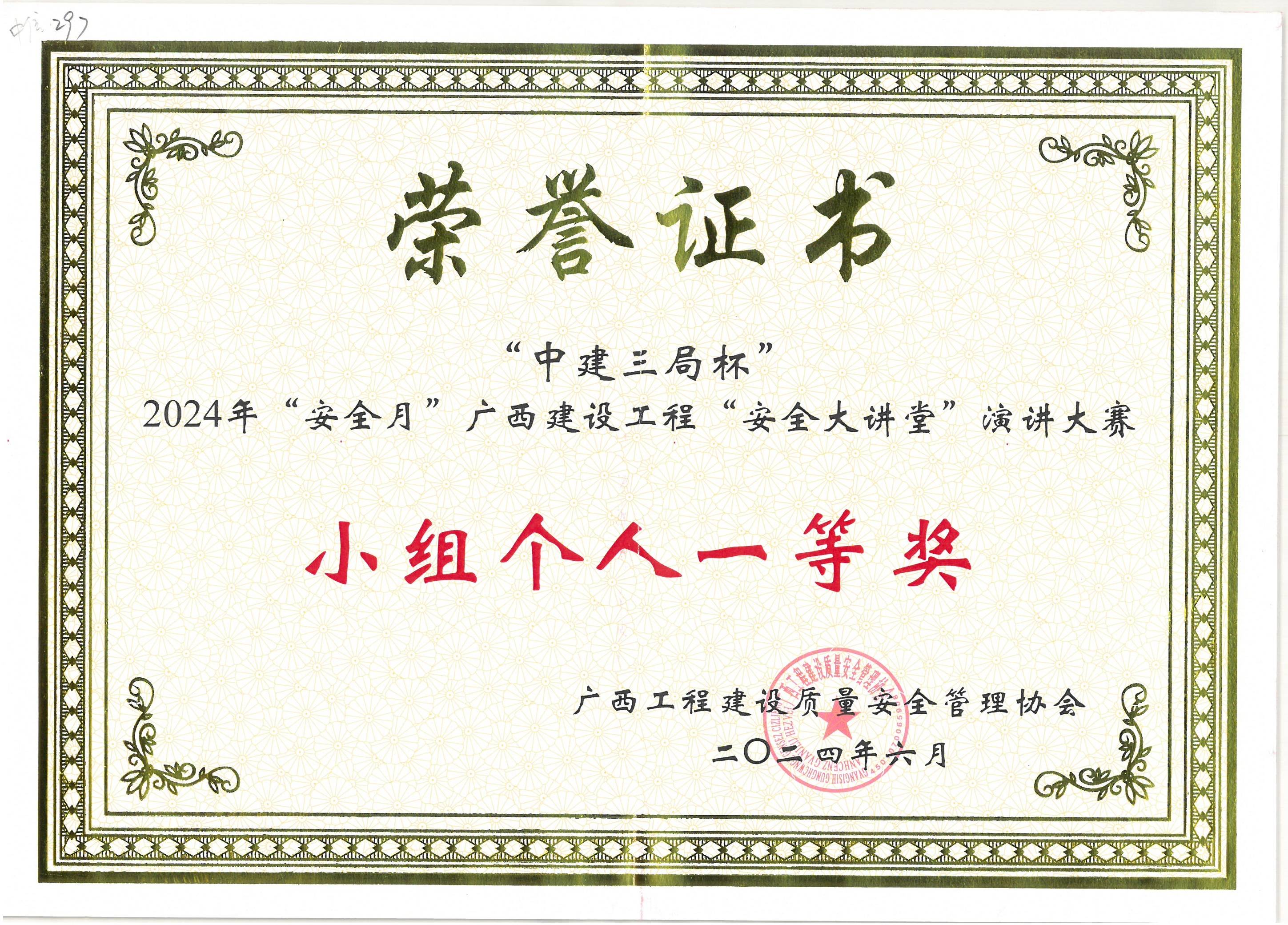 “中建三局杯”2024年“安全月”廣西建設(shè)工程“安全大講堂”演講大賽-小組個人一等獎