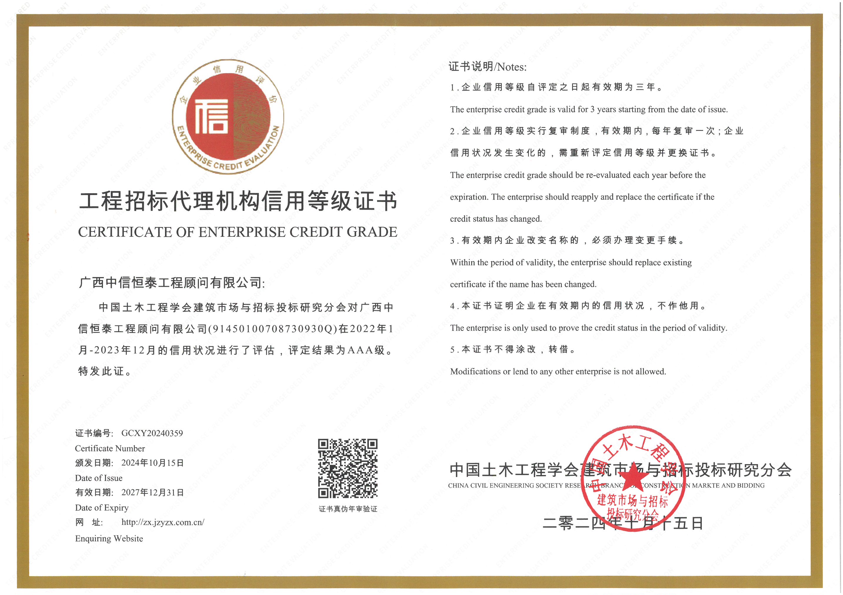 工程招標(biāo)代理機(jī)構(gòu)信用等級證書AAA級